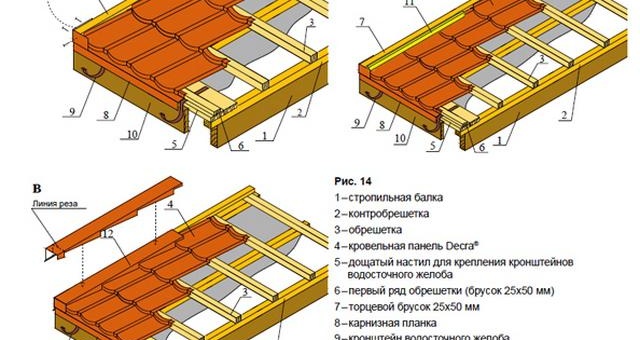 Плочките, положени по надвесите на фронтона и корниза, независимо от ъгъла на наклона на покрива, са фиксирани към гредите на щайгата. В останалите редове трябва да се закрепят само втората и третата плочка.