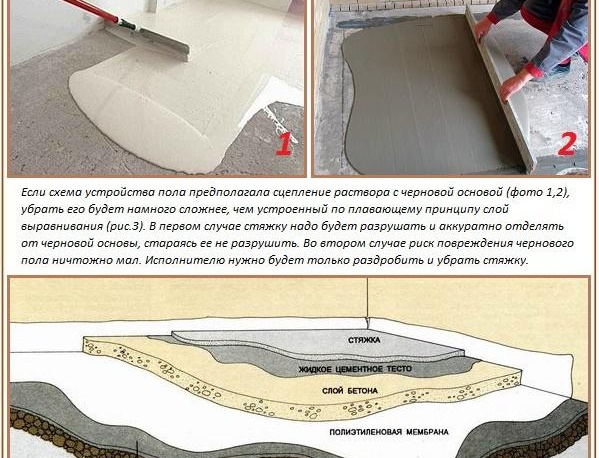 Когато започне основен ремонт във всяка стая, включително апартамент, цялата работа първоначално е насочена към демонтиране на старата подова настилка. Това включва и демонтаж. замазки. Процесът отнема много време и усилия. Но ако няма опит в извършването на този вид работа, по-добре е незабавно да се обърнете към специалисти. Това ще осигури отлично крайно качество.