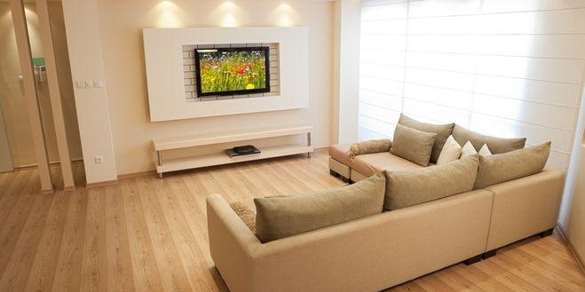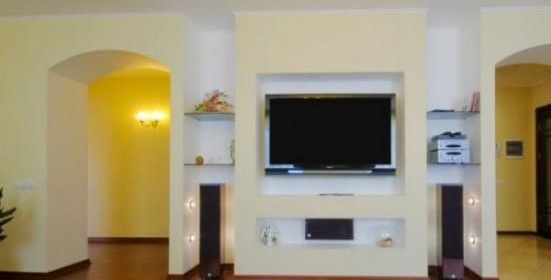 В стаята телевизорът изглежда по-хармонично в ниша. Да, и сигурността в този дизайн е по-висока.