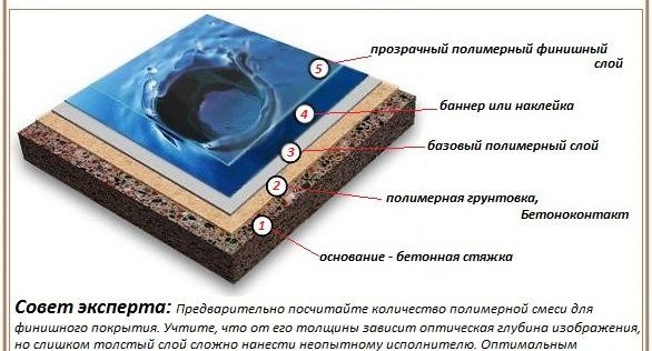 Ако има голямо желание да украсите стаята, където се извършва инсталацията, тогава с епоксиден под Много лесно се прави. Самото решение е ясно. Следователно, върху основата, под бъдещия под, се поставя картина, дърво, всеки друг материал, който може да добави жар към стаята. След заливане на всичко това със смес се получава истинско произведение на изкуството.