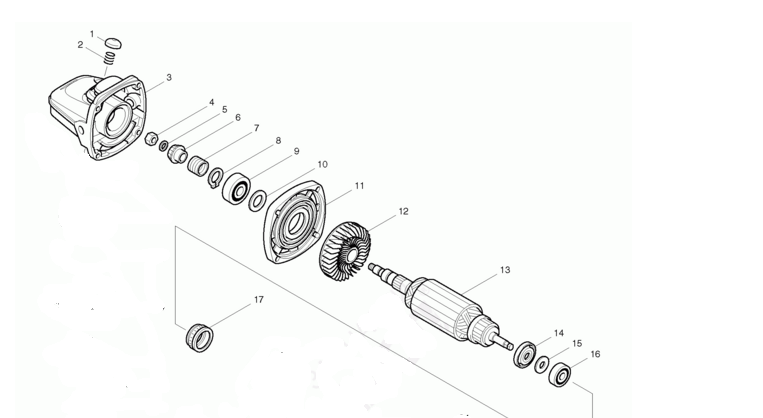 Пред вас е външният вид на мелница Makita 9565 ротор с изолираща шайба поз.14, плоска шайба 7 поз.15, лагер поз.16 и гумена обувка 22 поз.17. В ъглошлайфа се използва лагер 627zz от страната на комутатора. Руски аналог 80027.