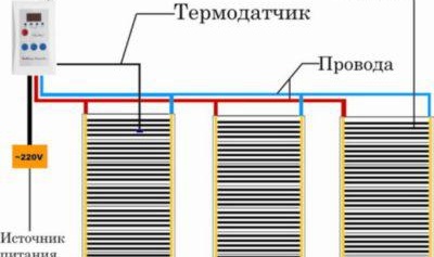 За инфрачервеното подово отопление се характеризира с паралелна връзка. За това се използват многожилни медни кабели. Напречното сечение на кабела трябва да бъде най-малко 1,5 mm2. Всички останали компоненти (датчик за температура, термостат) са свързани безпроблемно за висококачествена работа на отоплителната система.