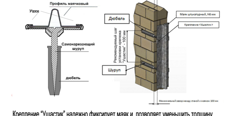 Шпакловката е много по-удобна и по-бърза, ако за нея използвате „маяци“ - специални алуминиеви, пластмасови и стоманени профили. Те действат като водачи за линийката и спомагат за постигане на равна повърхност на стената по време на процеса на мазилка. Това спестява не само време, но и материали. И една от най-добрите опции за бързо инсталиране на маяци под мазилка е използването на специални крепежни елементи. Например, като крепежни елементи "Ushastik" - малки метални пластини, монтирани върху самонарезни винтове.