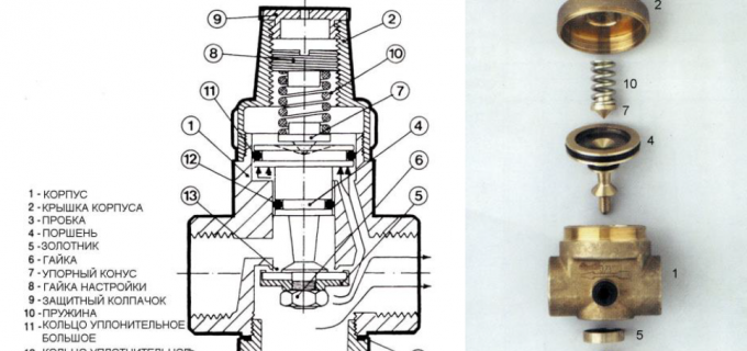 Предавателната кутия работи по следния начин: работната течност, влизаща във всмукателната камера, действа със същата сила върху макарата и върху долната повърхност на буталото. Еластичната сила на пружината задържа редуктора в отворено положение, докато налягането на течността в изходната камера, която действа върху горната "плоча" на буталото, се изравни с зададеното налягане.По това време намотката започва да затваря празнината между камерите, увеличавайки локалното съпротивление и намалявайки изходното налягане до предварително определено ниво. С помощта на месинговата регулираща гайка (8) редукторът може да се настрои на желано изходно налягане, различно от фабричната настройка (2 bar).