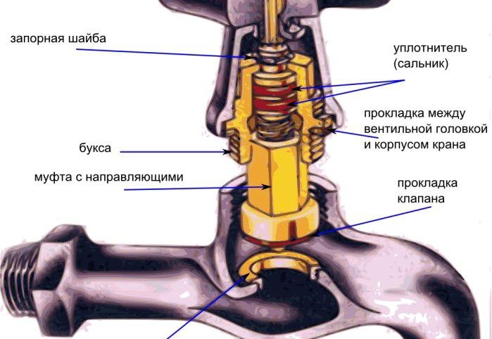 - Ако водата тече под вентила на крана, тогава е необходимо да смените уплътнението, разположено между тялото и главата на крана.