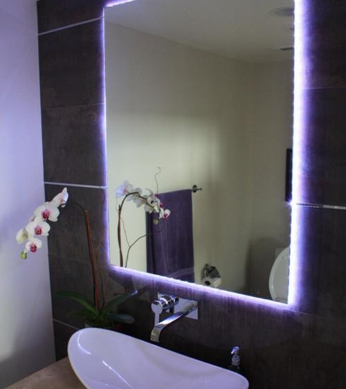 Последният тип осветление е декоративно, предназначено да изпълнява само функцията да допълва дизайнерския стил на банята. С помощта на такава подсветка е малко вероятно да постигнете висококачествено осветление, но можете да добавите нотка романтика към банята. Светодиодите тук са разположени по целия периметър на ръба на огледалото. Те могат да имат различни цветове. Важно е такова подсветка да може да се изключи по всяко време, за да се избегне изкривяване на отражението.