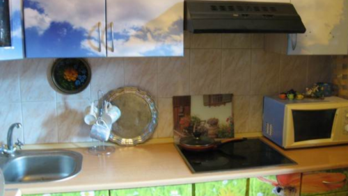 Най-популярното модерно решение е залепването на фасадата на кухнята с филм с фотопечат. Това ви позволява да създадете свой собствен уникален стил.