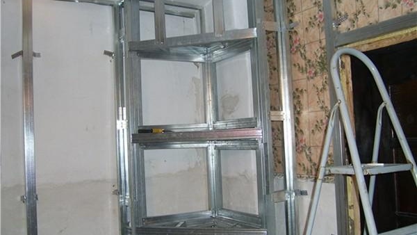 - След монтирането на основната конструкция е необходимо да се фиксират предварително подготвени части от профила на нишата към стената според маркировките. Освен това са монтирани напречни структурни елементи, които са усилватели и парапети за закрепване на гипсокартон.