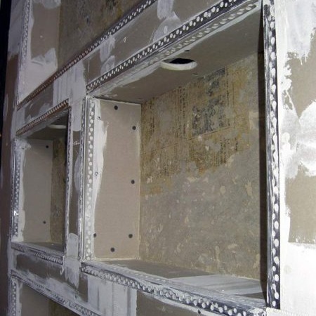 гипсокартон ниша в стената. След като основата на рамката е покрита с гипсокартон, всички фуги са подсилени с лепяща лента, подсилени с боядисани и залепени външни ъгли.