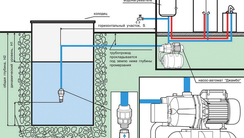 Помпената станция може да бъде поставена вътре в кладенеца, ако има място за нея, освен това за нея често се разпределят помощни помещения в самата къща или в стаята. Обърнете внимание колко дълбок ще бъде тръбопроводът. Тръбата трябва не само да бъде изолирана, но и да се постави под дълбочината на замръзване на земята, така че през студения сезон водата в нея да не замръзва.