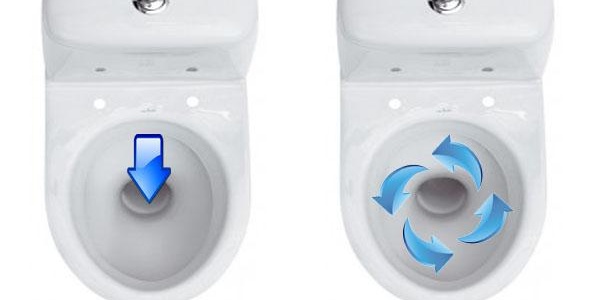 Кръговата система е по-сложна - водата тук се движи в кръгова посока и измива цялата повърхност на купата. Освен това не се нуждае от силен натиск, така че шуми по-малко и не позволява пръскане. Но има и недостатъци - системата ще струва повече, а малките дупки за изхода на водата под ръба на тоалетната могат да се запушат с отлагания с течение на времето.