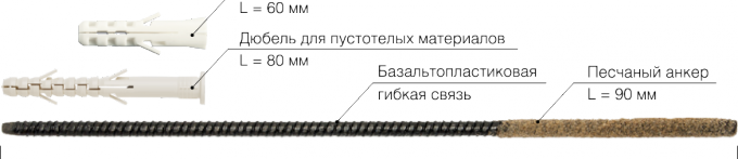 Друг надежден начин за закрепване на облицовъчни тухли към стена от пенобетон е използването на гъвкави крепежни елементи. Има различни версии и производители. Има няколко вида такива материали: фибростъкло, базалтова пластмаса. Вярно е, че цената им варира от 10 до 60 рубли. на бройка, и не винаги е възможно да се купи.