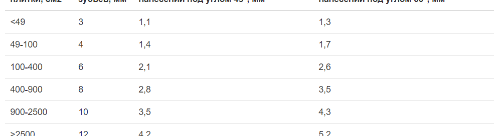 Нека да разгледаме приблизителните размери на зъбите в зависимост от повърхността на плочката, при условие че самата шпатула е малко по-широка от ширината на плочката.