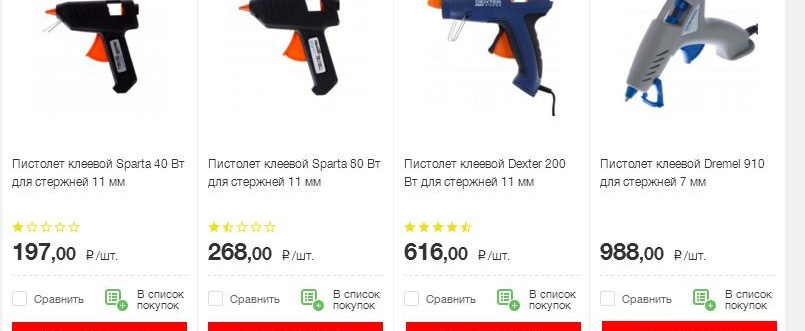 Попаднах на факта, че много евтините оръжия не работят много дълго, те издържат няколко приложения и след това умират. Опитвам се да избера на цена от поне 500 рубли, по-добре е да купите веднъж и ще служите дълго време, отколкото постоянно да купувате нов. Освен това при много евтини пистолети не всички лепила ще се стопят, някои нямат достатъчна температура. Как пишат тук Има много лепила с различни свойства, трябва да изберете според вашите нужди.