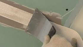 - След залепването на лентата шпакловката трябва да се втвърди малко. Върху лентата се наслагва друг слой мастика, който вече затваря лентата, местата на крепежните елементи на гипсокартона.