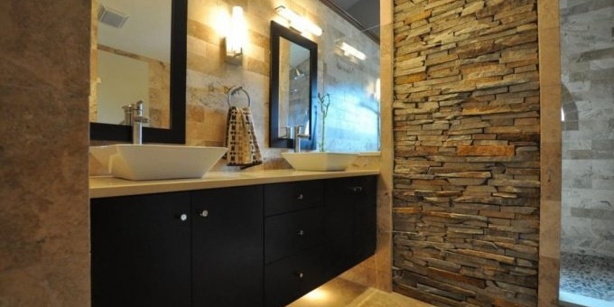 Повечето видове естествен камък са идеални за декориране на банята, тъй като не се страхуват от влага и високи температури.Те могат да се видят в сауната, спа зоната и парната баня. Естественият материал е напълно хигиеничен и безопасен. За разлика от други покрития, той не се страхува от гъбички и мухъл. Без неприятни миризми, гниене и алергии!
