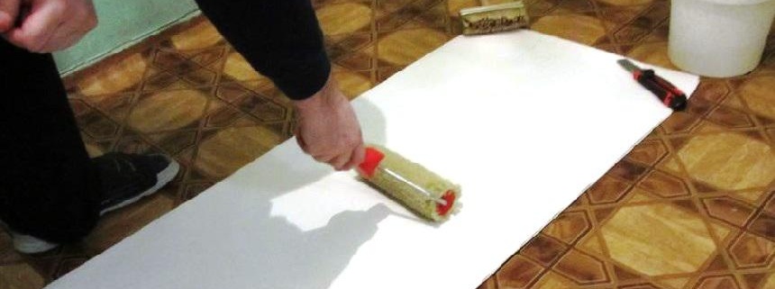3. Когато тапетът е нарязан на панели и е начертана линия, трябва да залепите тапета. За удобство поставете платната на пода, като ги покриете с филм или вестници. За нанасяне на лепилото използвайте специални устройства, валяк или четка.