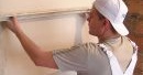 2. С помощта на валяк нанесете лепило върху платното и го оставете за 5 минути, така че да се насити. След това можете да започнете да залепвате. Натиснете ръба на тапета към тавана и го дръпнете надолу, оставяйки 3-4 см за подрязване.