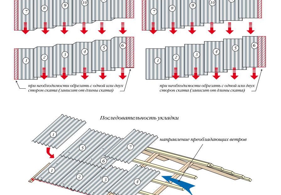 За удобство на работата, преди да започнете, към всеки лист по протежение на корниза са прикрепени две противоветрови опори, така че с извитите си краища да държат здраво азбестоциментовия лист зад хребетите на вълната.В края на полагането на първия ред по него с молив или тебешир се изчертава линия на припокриване, след което се полага вторият ред.