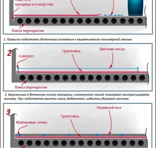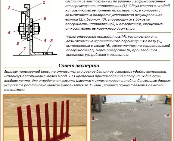 - В допълнение, тези маяци са фиксирани върху цялата повърхност на помещението, където се извършва инсталацията саморазливен под.