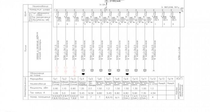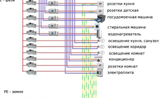 Напрежението се подава към входната машина (по-добре е, ако е биполярно) и отива към еднофазен електромер, откъдето отива към RCD. След това има разделяне на фазите и директно разпределение на натоварването с помощта на допълнителни прекъсвачи и RCD. Например отделно ще има машини за осветление, контакти и мощни консуматори.