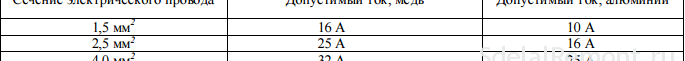 Допустимият ток също ще бъде различен от използвания кабел (сечение и материал). Колкото по-голямо е сечението на електрическия проводник, толкова по-високо е максималното ниво на ток. По-добре е медните кабели да бъдат положени под системата за подово отопление, което е отразено в таблицата.