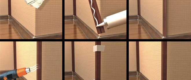 - 1. Пластмасовите ъгли се монтират върху предварително подготвена повърхност. Ако е необходимо, залепете или премахнете старите тапети с нож.