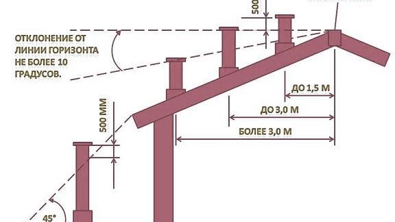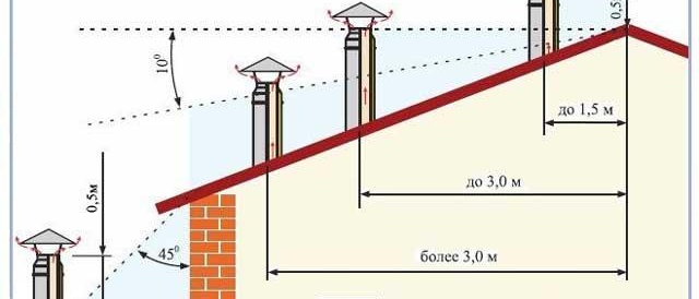 Трябва да знаете правилото, че дължината на комина от пещта до мястото, където изпаренията излизат в атмосферата, не може да бъде по-малка от 5 m. При плосък покрив най-малката височина на комина над покрива е фиксирана на 1,2 метра.