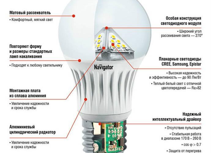 Лед лампата, за разлика от лампата с нажежаема жичка, се характеризира със светене на светодиод, свързан чрез специален драйвер - специална платка, която преобразува напрежението от 220 волта от битовата електрическа мрежа в напрежение от 3-3,5 волта за захранване на светодиода елемент.