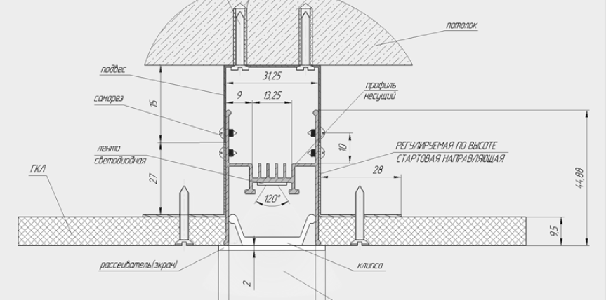 Монтажът на плаващата линия се извършва в таван от гипсокартон с носещ профил, който придава допълнителна здравина на цялата конструкция. Този профил се монтира при създаване на метална рамка за таван от гипсокартон.