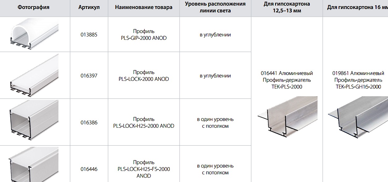 Този артикул е изработен от алуминий. Той е лек, което е много важно при монтаж в таван от гипсокартон. Основно за линията на лекия полет се използва профилът на марката PLS, който се монтира върху носещия профил TEK с дебелина 12,5, 13, 16 mm.