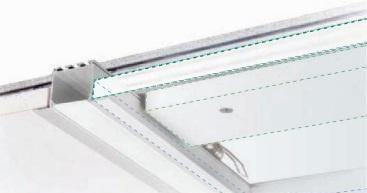 - Профилът PLS-LOCK-Y25_FM-2000 е монтиран в метална рамка, леко издаден от единичната равнина на гипсокартонената конструкция.