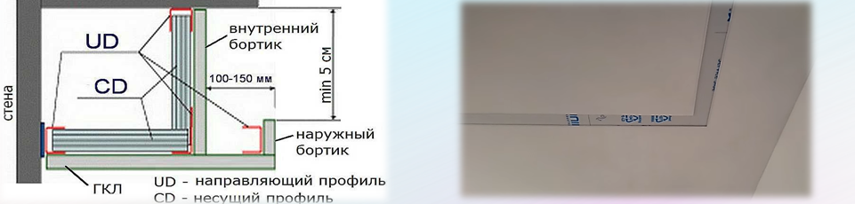 От PNP водача на тавана се спускат стелажите, изрязани в профилите, с височина, равна на дълбочината на нишата - до линията на режещия шнур за долния профил. Стелажът се изрязва така, че едната страна, съседна на гипсокартона, е с 5 см по-дълга от целия ръб. Стъпката на фиксиране на стелажите е 25-30 см.