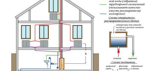 В двуетажна сграда може да се използва естествена циркулация.Тук ще бъде достатъчно да поставите разширителен резервоар в него не на тавана, а на втория етаж. Захранващата тръба по време на монтажа се монтира под перваза на прозореца в стаята или под тавана. Ако замените всичко това с циркулационна помпа, можете да използвате допълнителен източник на топлина в стаята - подово отопление, както и отопляеми релси за кърпи. И това може да се направи не само на първия, но и на втория етаж на сградата.