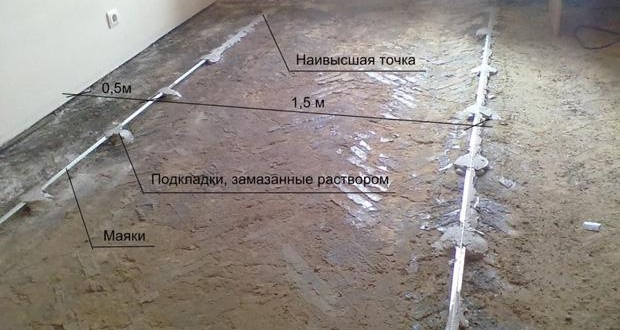 Повърхността трябва да е равна и гладка. За да направите това, първо трябва да определите нивото в стаята. Това може да се направи под формата на маркировки по стените с помощта на водно ниво. По-точни индикатори се осигуряват от лазерно ниво, но не всеки има възможност да го използва в работата си.