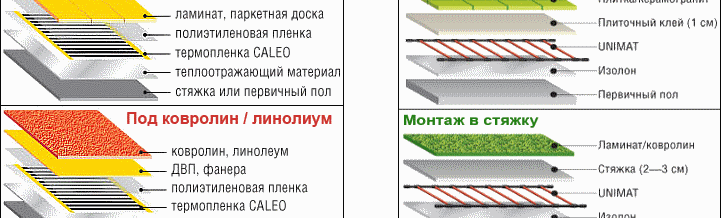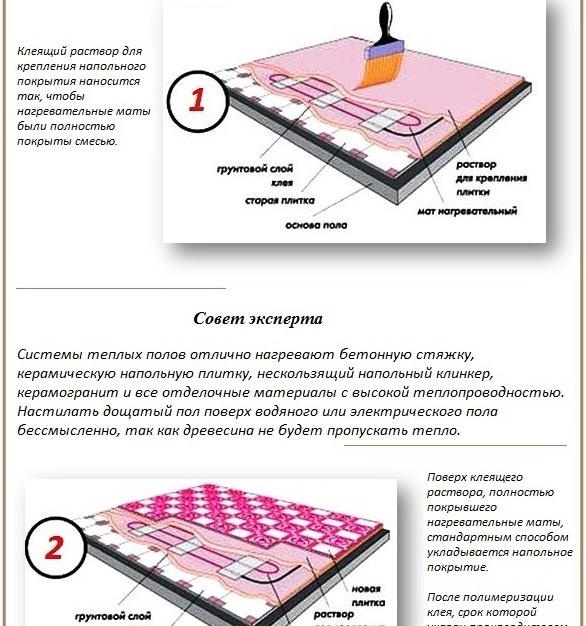 За конкретни опции за подови настилки има специфични характеристики за полагане на филма. Да за керамични плочки трябва да се използва специално лепилопредназначен за система за подово отопление. Дебелината на лепилния слой не трябва да бъде по-малка от 15 mm.