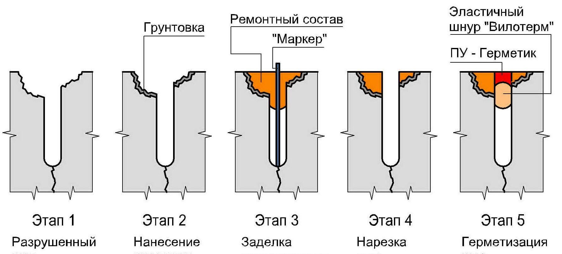 Бетонът от разрезите се отстранява с длето, както беше направено преди с малки дефекти. Остава само да се излее приготвената циментова замазка, която трябва да изсъхне в рамките на определеното време.