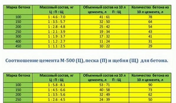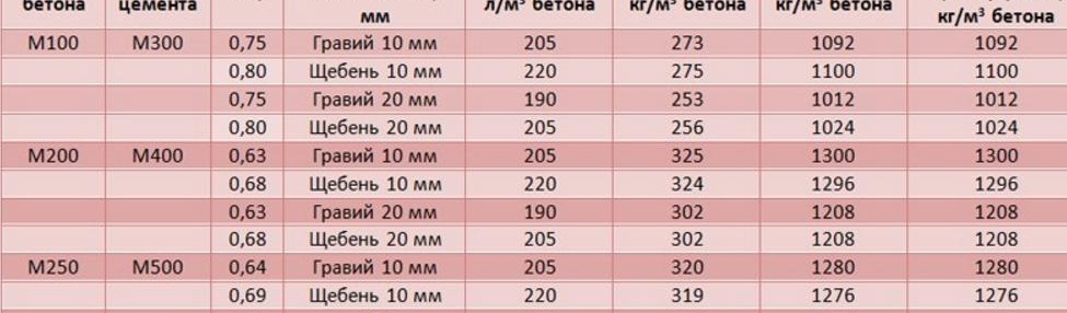 Таблица с обемни пропорции за различни степени на бетон