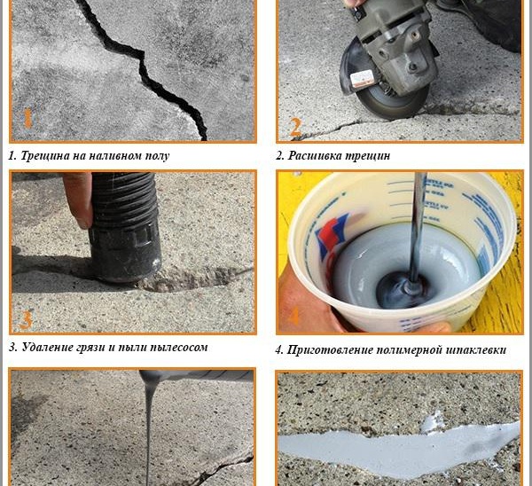 Появилите се пукнатини трябва да бъдат разширени, почистени и обработени с армиращ грунд.Веднага след като повърхността изсъхне, в нея се излива специален ремонтен бетон, след което се полира.