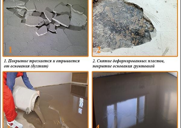 За да се отървете от такова негативно явление, трябва да премахнете зоната, която се е отдалечила от основата, и след това старателно да я почистите от евентуален прах и мръсотия. Освен това можете да избършете мястото с влажна кърпа. След това се нанася грунд на 2-3 слоя. Остава само да напълните саморазливната смес на едно ниво с цялата повърхност.