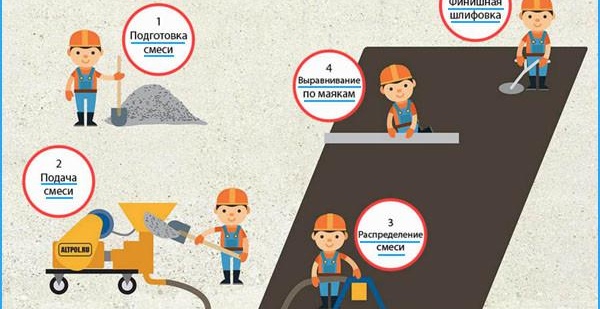 Работата се извършва най-добре от 2-3 души едновременно. Единият ще омеси разтвора, вторият ще го разпредели по повърхността на помещението, а третият вече ще започне да набива и смила повърхността под подовото покритие.