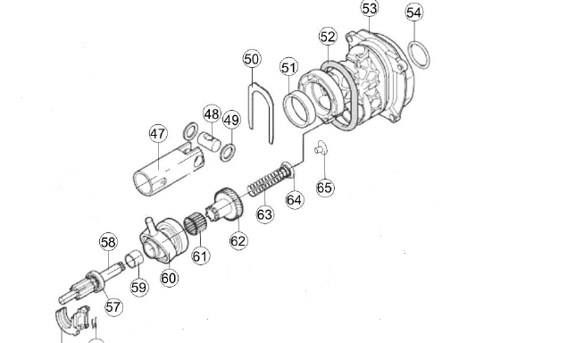 Бутален монтаж поз. 47 започнете с инсталиране на пръст poz.48 и два пръстена poz.49 върху него. Пръстът действа като повод на сачмен лагер poz.60. Ударникът поз.45 се вкарва в буталото с предварително монтиран уплътнителен пръстен поз.46.