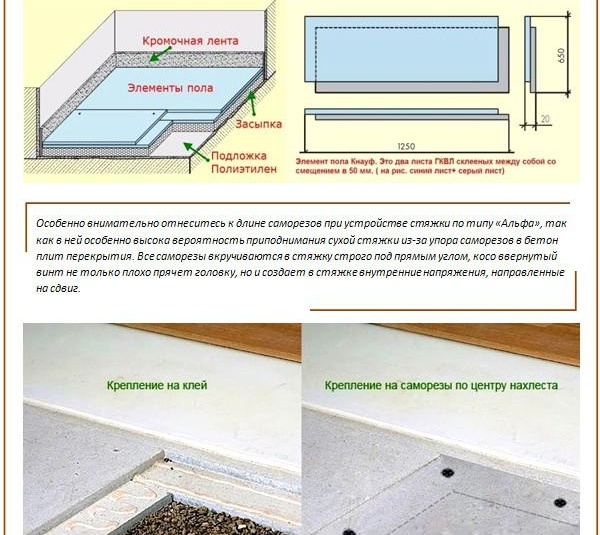 използвайки равен под суха замазка получени при спазване на технологията. Като подов елемент можете да използвате различни листови материали, които могат да бъдат: