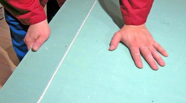 Листът се поставя върху равна маса. Отбелязва се с молив. По протежение на линията, с помощта на владетел и остър нож, се прави разрез на половината от дебелината на гипсокартона. След това врязаната част трябва да излезе извън границите на масата, когато натиснете върху нея, листът ще се пръсне в зоната на изрязване. Едно парче трябва да се сгъне, оставяйки сгъната лента от картон от другата страна. Сега с тези 2 парчета, които са върху същия картон, направете равен ъгъл от 90 градуса.Ножът се поставя, докато острието спре в ъгъла на ъгъла на гипсокартона, създаден и внимателно изтеглен по цялата линия на огъване. Така листът ще бъде нарязан равномерно.
