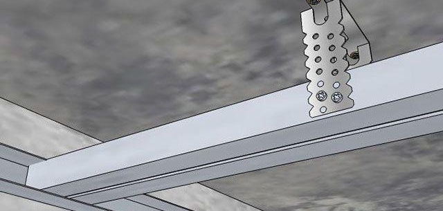 - Следващата стъпка ще бъде монтирането на закачалките. Първият ред близо до стената на проекта на тавана - окачванията се фиксират на разстояние 25 см. Всеки следващ ред - фиксирането се извършва след 50 см. За да фиксирате елемента, е необходимо да залепите шпакловка, за да елиминирате контакта на метала с бетонната повърхност. Можете да завържете панделката на закачалката и след това да я фиксирате. Окачването е фиксирано само с анкерни болтове. Тъй като таванът от гипсокартон има тегло, той трябва да бъде монтиран стабилно. Самонарезните винтове не могат да издържат на натоварването и изскачат от основата.