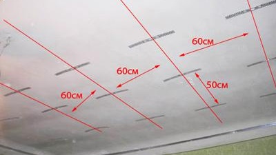 Сега можете да маркирате напречните линии, създадени от профила на тавана. Между основните редове се полагат кръстосани редове на разстояние 40 см един от друг. Това ще укрепи дизайна на фалшивия таван. Връзките също са маркирани върху тези сегменти.
