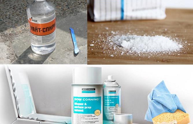 Един от често срещаните отговори на въпроса как да премахнете изсъхналата замазка от повърхността е готварската сол. Нивото на ефективност на метода зависи от възрастта на нанасяне на лепилото. Технологията на отстраняване се състои в използването на парче марля или превръзка, сгъната на 5 слоя. Върху превръзката се нанася сол и върху нея се стича вода. С мокра солена маса внимателно избършете мястото, където е останал силиконът. В този случай е необходимо да се гарантира, че солта не изсъхва и не разваля повърхността.