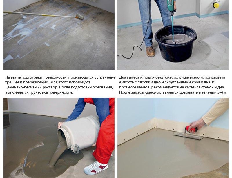 Саморазливна смес разпределени по цялата повърхност. За работа можете да използвате моп с гумена основа.При наличие на въздушни мехурчета всички те се отстраняват с моп с шипове, който трябва да е по-дълъг от дебелината на засипката.