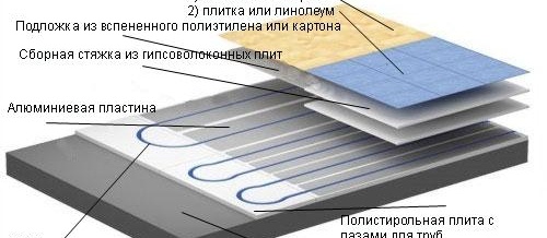 Топъл под под суха замазка на дървена модулна система е малко по-различна от стелажа. Основното тук е, че тръбите за отопление не трябва да се полагат между релсите, а в специалните канали на модула, които могат да бъдат ПДЧ или OSB.
