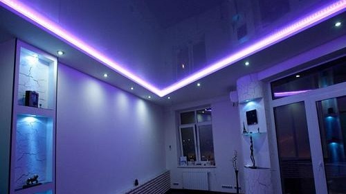 Монтираната под опънатата LED лента постига ефекта на светещ таван. Ако собствениците на помещенията са привърженици на смели дизайнерски решения, тогава под платното може да се постави определен модел с панделка. В този случай таванът може да се превърне в основен елемент на интериора.